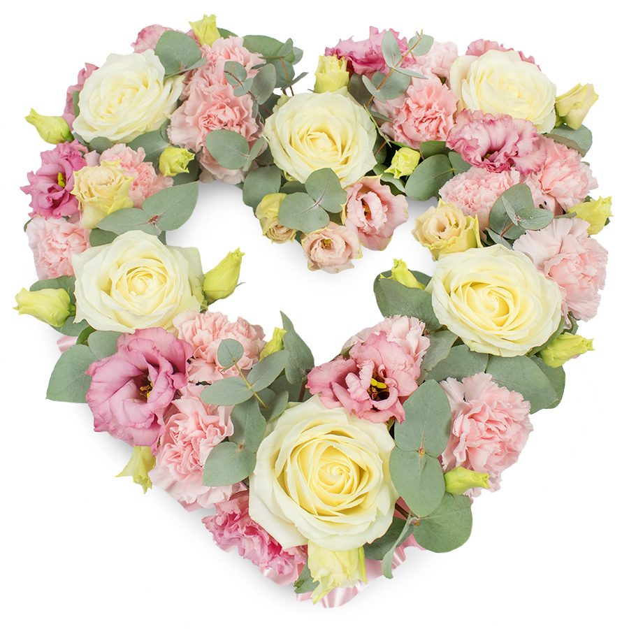 Honor lasting memories with our elegantly arranged bouquet. Each flower is expertly hand-selected to deliver unmatched freshness and vibrant hues. The graceful combination of luminous white roses, tender pink carnations, and soft pink lisianthus, accented by hints of eucalyptus, creates an arrangement that exudes both beauty and heartfelt sentiment.